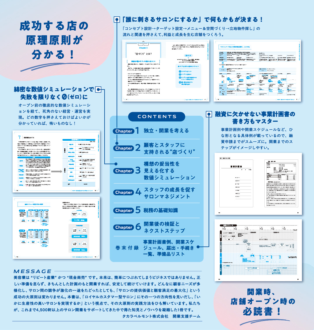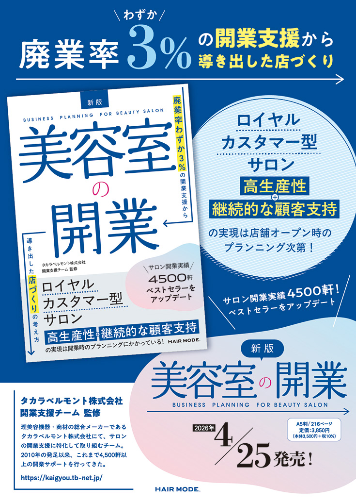 美容業は “リピート産業” かつ “現金商売” です。 本来は、簡単につぶれてしまうビジネスではありません。正しい準備を怠らず、きちんとした計画のもと開業すれば、安定して続けていけます。どんなに顧客ニーズが多様化し、サロン間の競争が激化の一途をたどったとしても、「サロンの提供価値と顧客満足の最大化」という成功の大原則は変わりません。本書は、「ロイヤルカスタマー型サロン」にその一つの方向性を見いだし、「いかに生産性の高いサロンを実現するか」 という視点で、その大原則の実践方法をひも解いています。私たちが、 これまで4,500軒以上のサロン開業をサポートしてきた中で得た知見とノウハウを凝縮した1冊です。